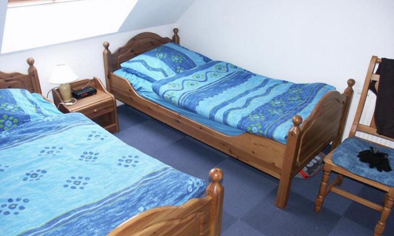 Die Zimmer sind mit Betten, Schrank, Tisch, Stühlen, Fernsehgerät ausgestattet.